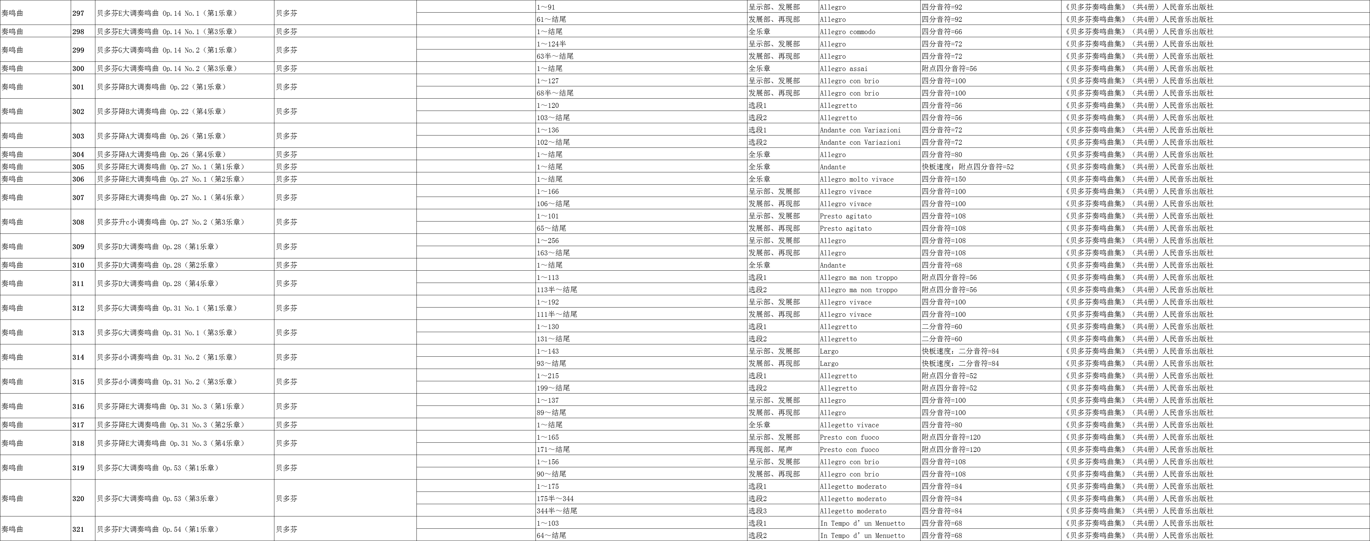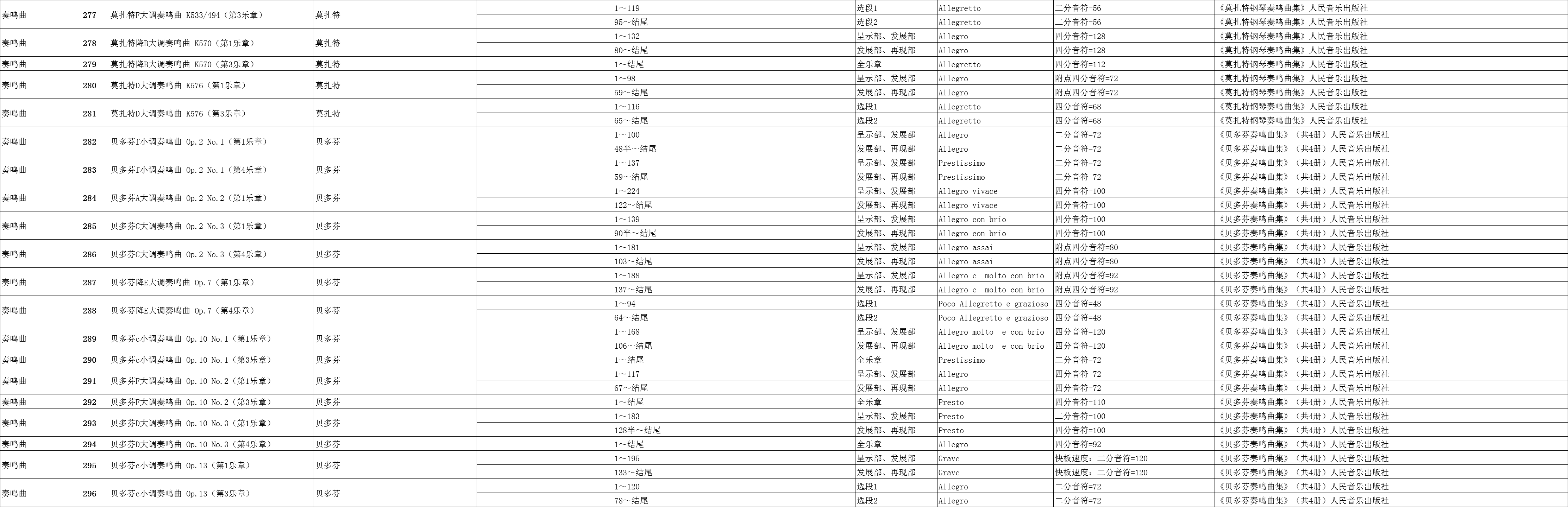 钢琴奏鸣曲规定曲目324 贝多芬f小调奏鸣曲 Op.57(第3乐章) 贝多芬 1~212 呈示部、发展部 Allegro ma non troppo 四分音符=104 《贝多芬奏鸣曲集》(共4册)人民音乐出版社